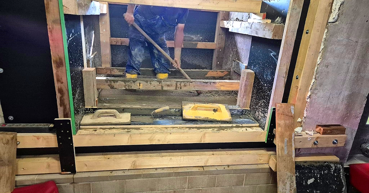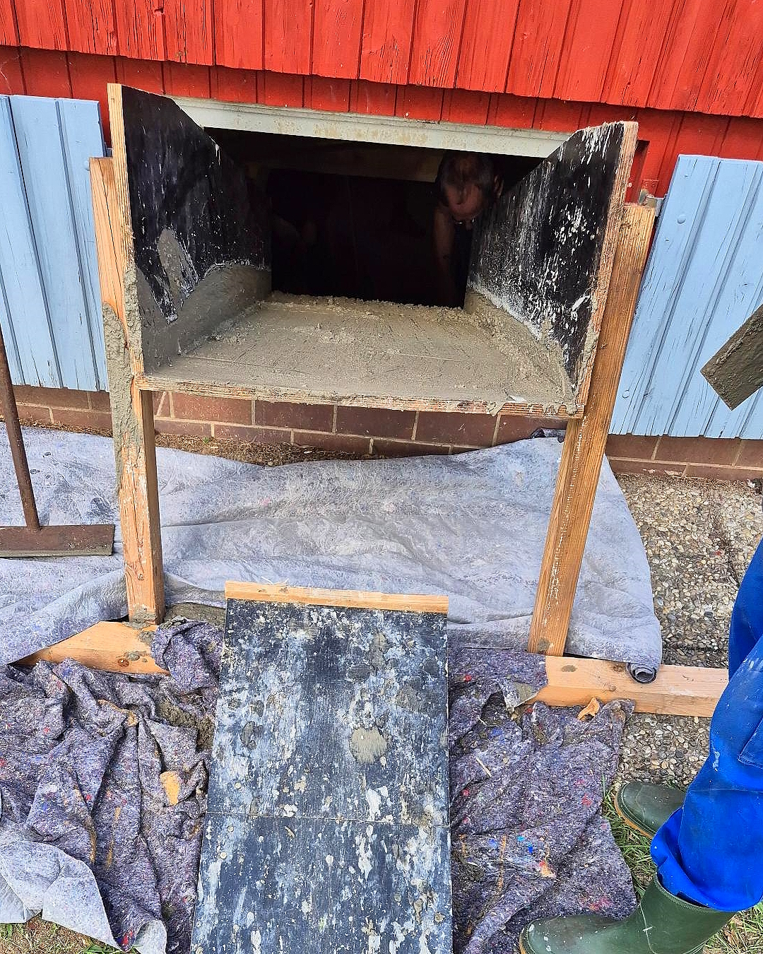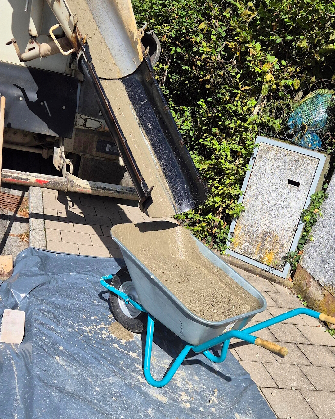 85 (!) Schubkarren Beton wurden händisch über eine Betonrutsche durch das Kellerfenster in die Form gegossen.